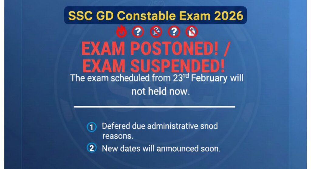 SSC GD Constable Exam Postponed SSC GD Constable Exam Update 2026: कर्मचारी चयन आयोग (SSC) की तैयारी कर रहे लाखों उम्मीदवारों के लिए एक बड़ी और महत्वपूर्ण खबर सामने आई है। अगर आप भी 23 फरवरी 2026 से शुरू होने वाली SSC GD कांस्टेबल परीक्षा की तैयारी कर रहे थे, तो यह जानकारी आपके लिए बेहद जरूरी है।